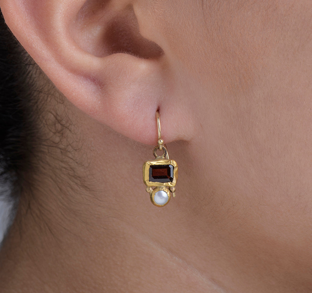 London Earrings are handmade earrings to make your everyday style extraordinar...y. The large cognac-hued rectangular garnet and small round pearl neatly wrapped in 24K gold make it a timeless piece that never goes out of fashion. Luxury that fits your lifestyle!