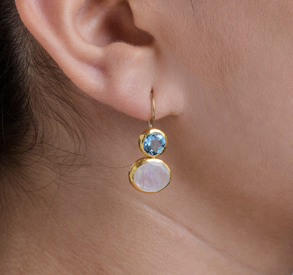 These luminous Nava Zahavi earrings pair the cool brilliance of round blue top...az with the soft, ethereal glow of oval moonstone. The vivid blue topaz adds a sparkling pop of color, while the moonstone shimmers with subtle iridescence, creating a harmonious blend of light and tone. Each gemstone is meticulously wrapped in pure 24K gold, enhancing its natural beauty with a warm, luxurious glow. Measuring 28mm in length and 18mm in width, these earrings offer a graceful silhouette and elegant movement—perfect for adding refined color and artisanal craftsmanship to any ensemble.
