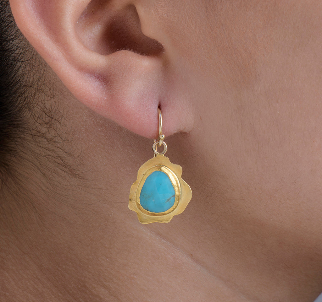 Nava Zahavi’s Egg-Shaped Turquoise Earrings are a stunning fusion of natural b...eauty and luxurious design. Each earring features a smooth, egg-shaped turquoise stone, its vibrant blue-green hue evoking the tranquil beauty of a serene sky or sea. Wrapped in 24K gold with an uneven, organic frame, these earrings embrace the natural contours of the stone, highlighting its raw elegance. The irregular gold border adds an artisanal touch, emphasizing the individuality of each piece. These earrings are perfect for adding a pop of color and a hint of opulence to any look, ideal for those who appreciate the unique charm of handcrafted jewelry.